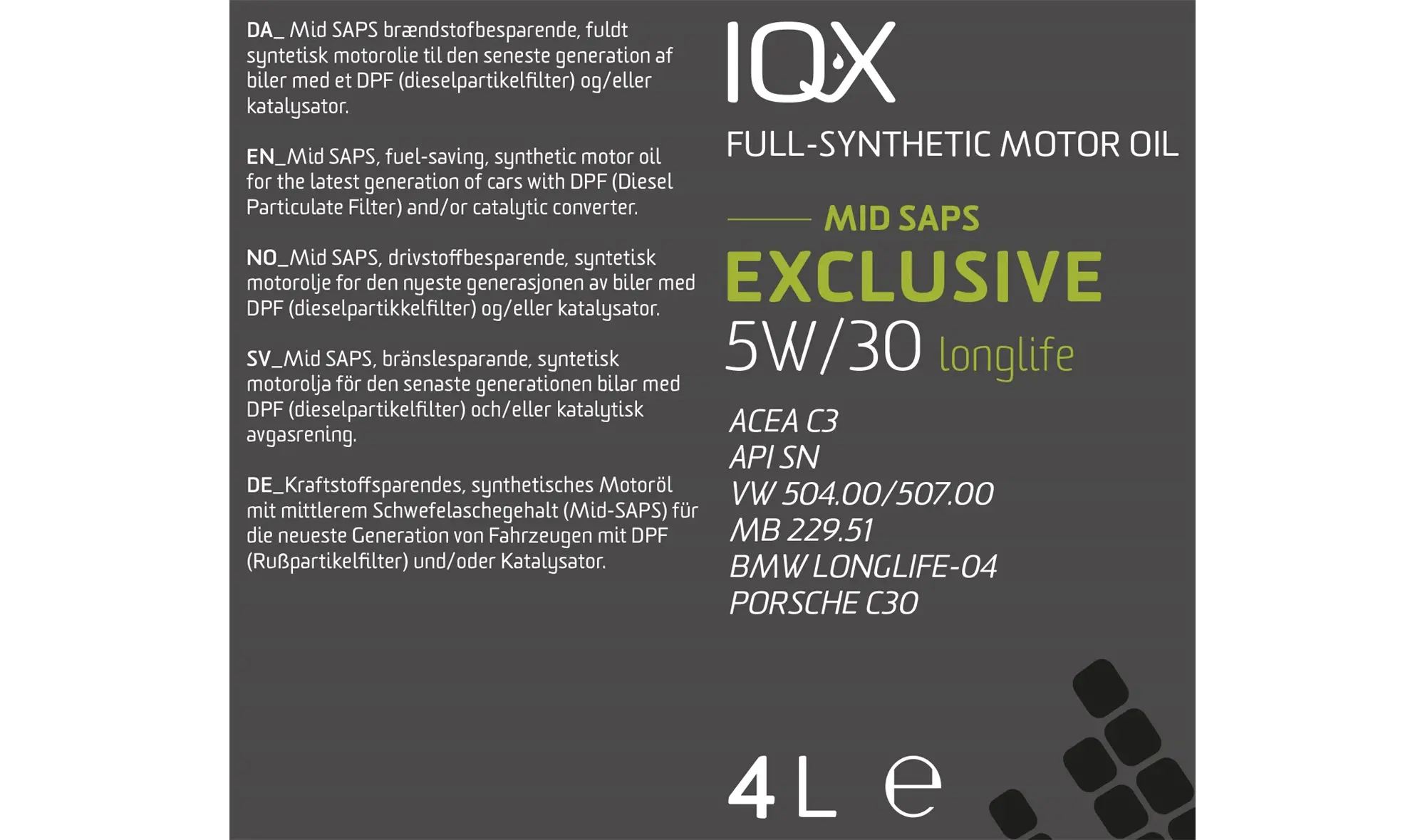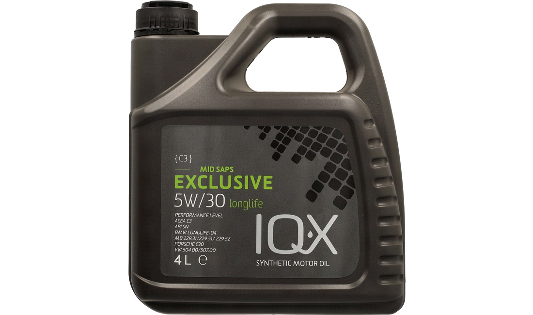 IQ-X Exclusive 5W-30 er en langtidsholdbar, fuldsyntetisk motorolie, der er baseret på særligt udvalgte baseolier i kombination med den seneste generation af Low SAPS avancerede additiver. Olien er udviklet i samarbejde med Volkswagen-gruppen. Denne motorolie sætter helt ny industristandard for egenskaber i en motor, og gør alt for at minimere skadelige udstødningsgasser, der kan skade miljøet.